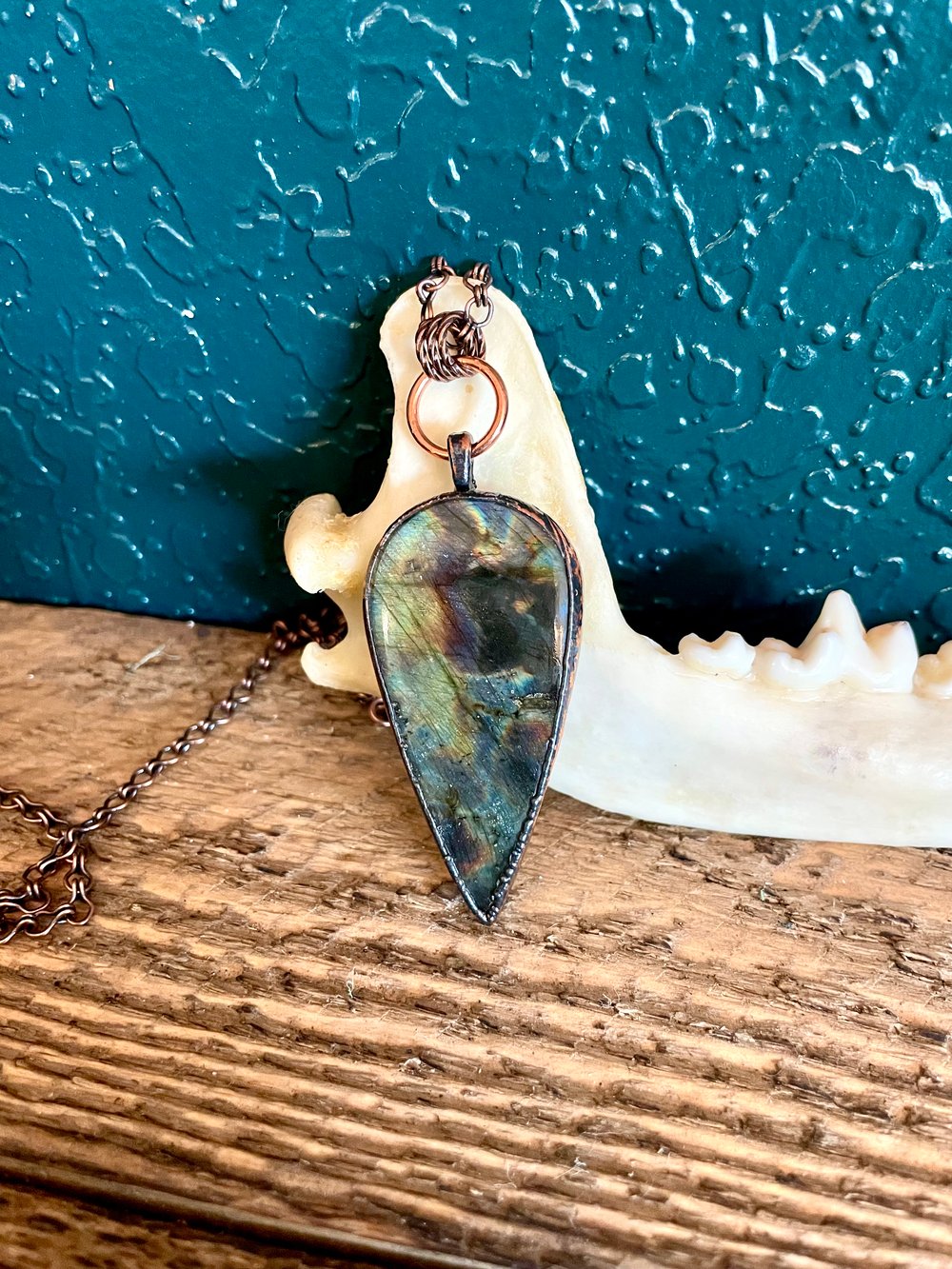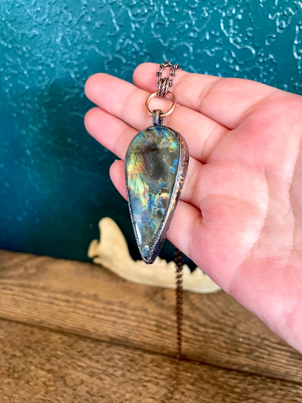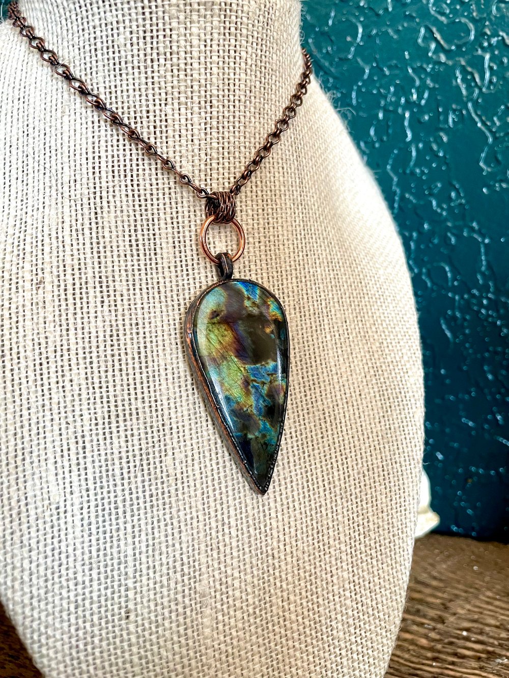 Flashy upside down teardrop shaped Labradorite pendant with detailed bail.