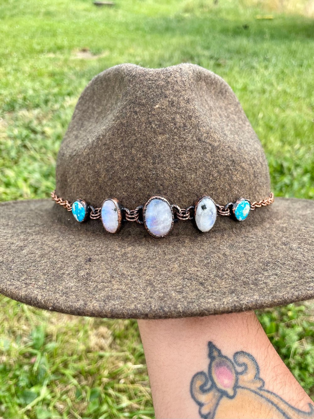 This hat band features three moonstones with stunning flash and beautiful round turquoise stones on either side.