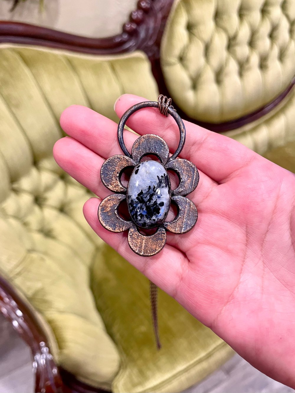Flashy oval Moonstone with Black Tourmaline inclusions. Moon shaped accents were placed around stones before being formed making it look like a 70's inspired flower.