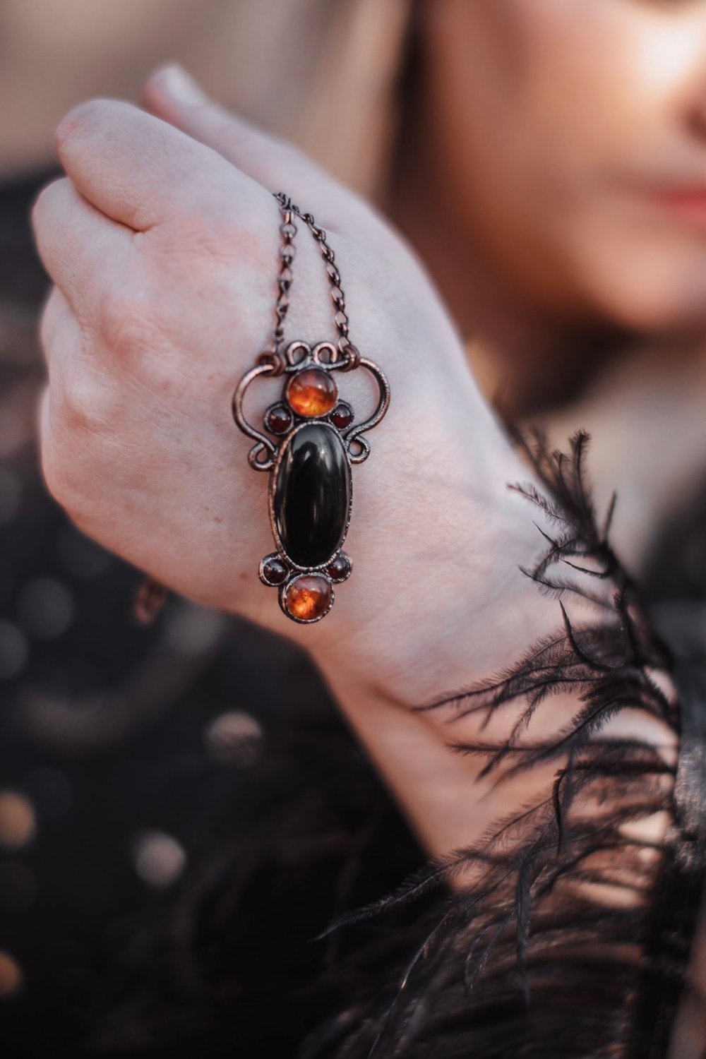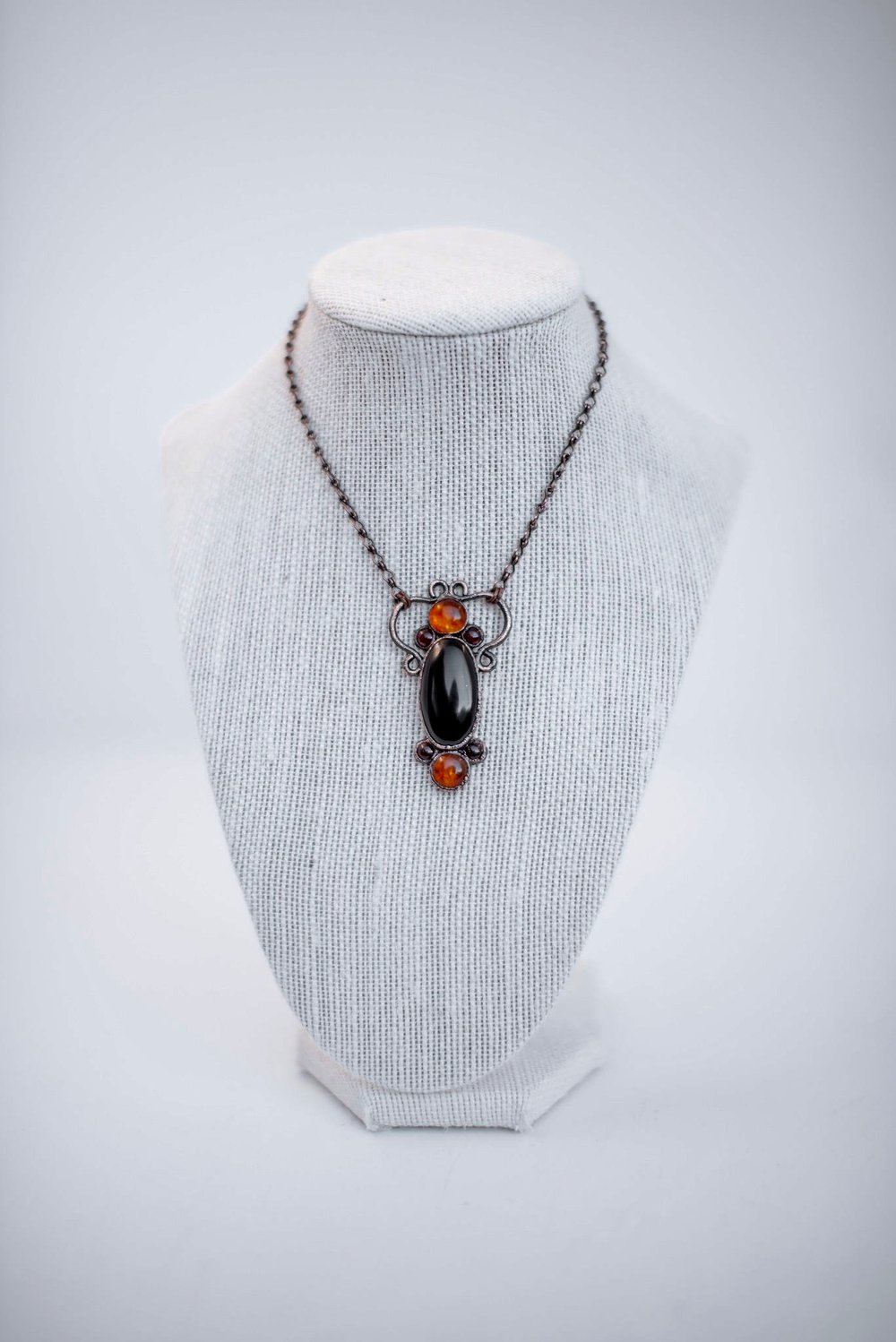 An oval shaped Onyx stone rest between to bold round Amber cabochons while being accented with four small Garnets. Finished with a wispy bail for delicate detail.