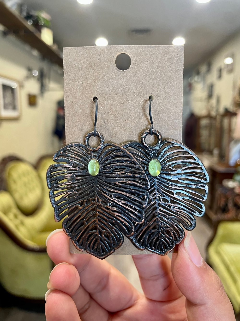 Monstera leaf earrings with cutout detail and small Peridot stones.