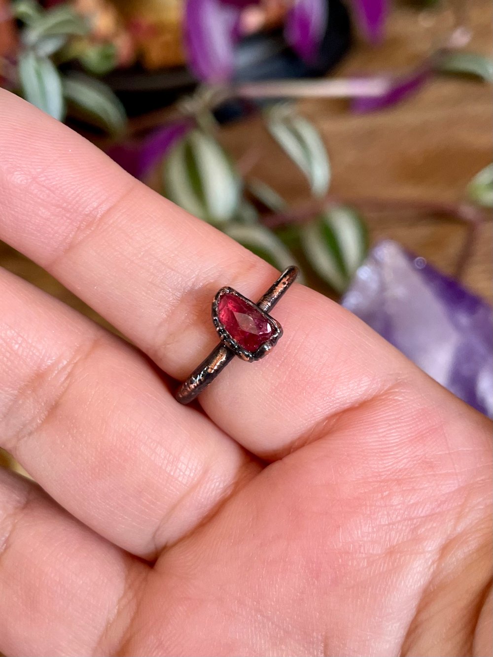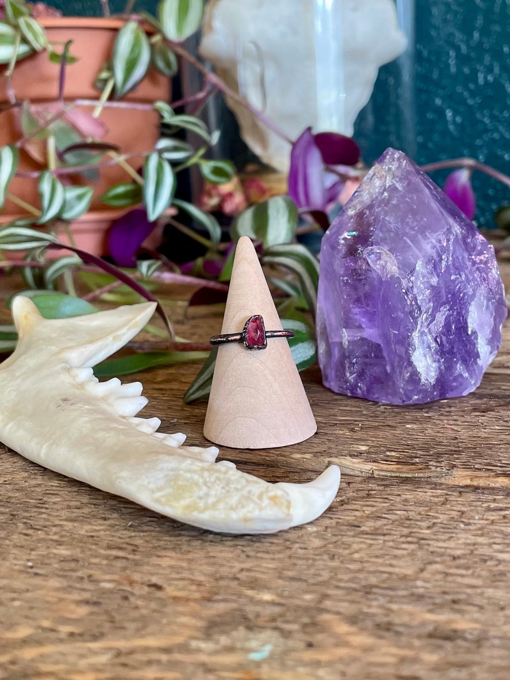 Tiny stacker ring with a deep pink Tourmaline stone set in copper.