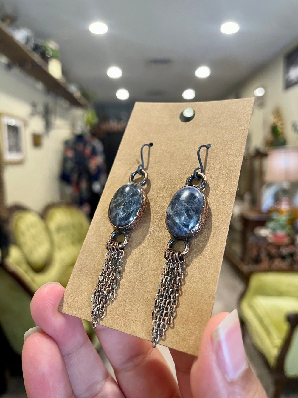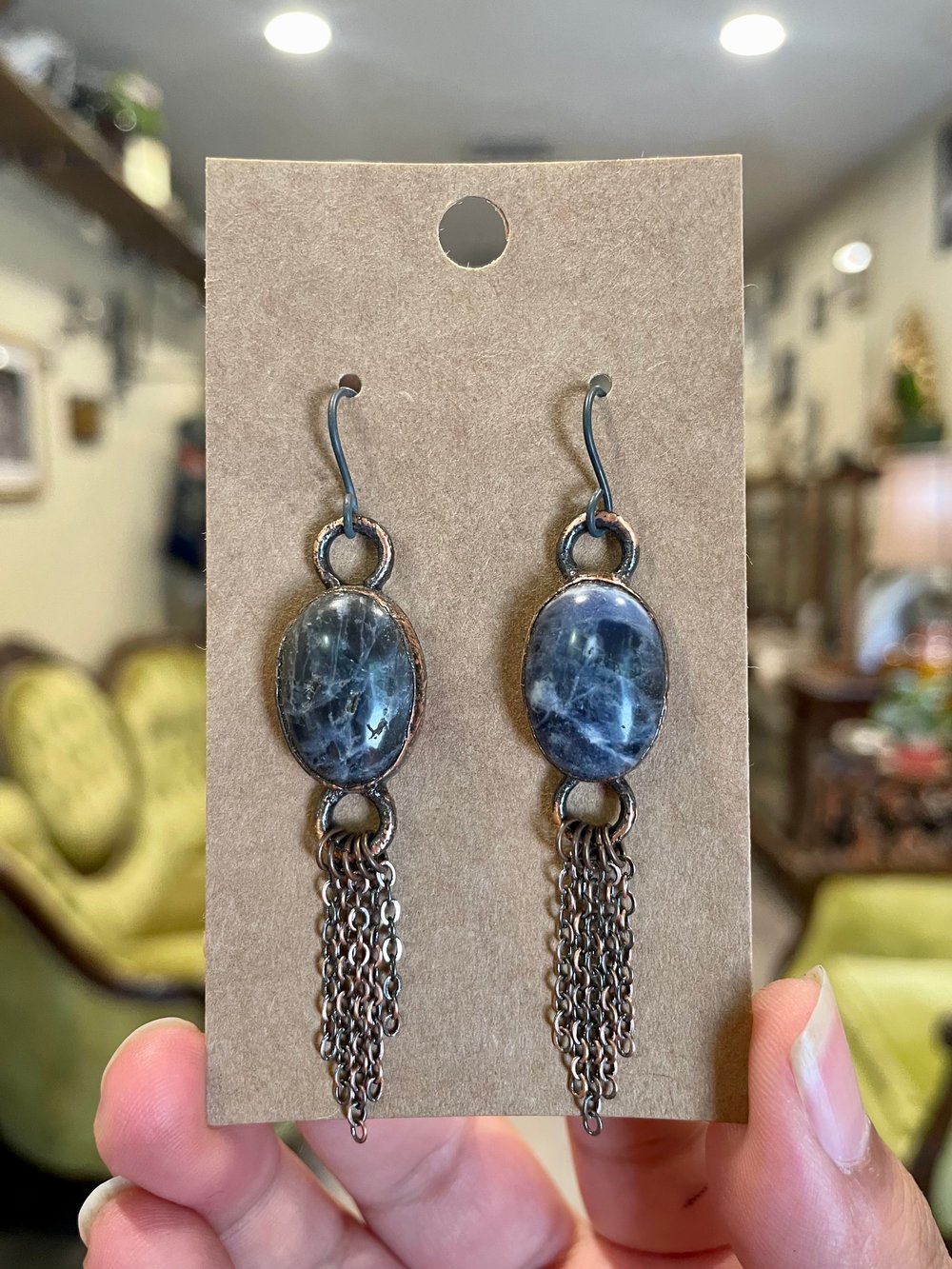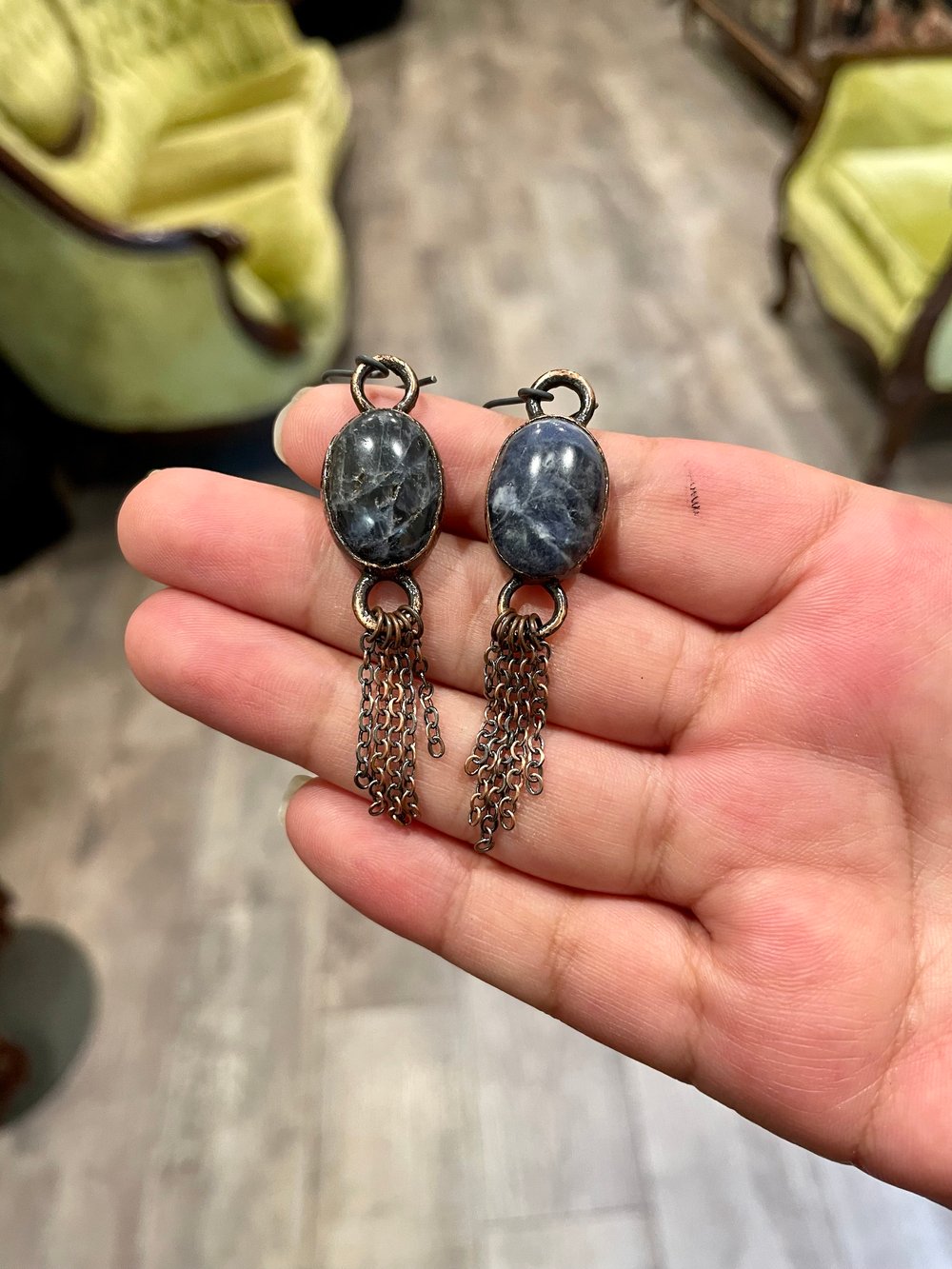 Petite dangly earrings with Sodalite stones and copper fringe.
