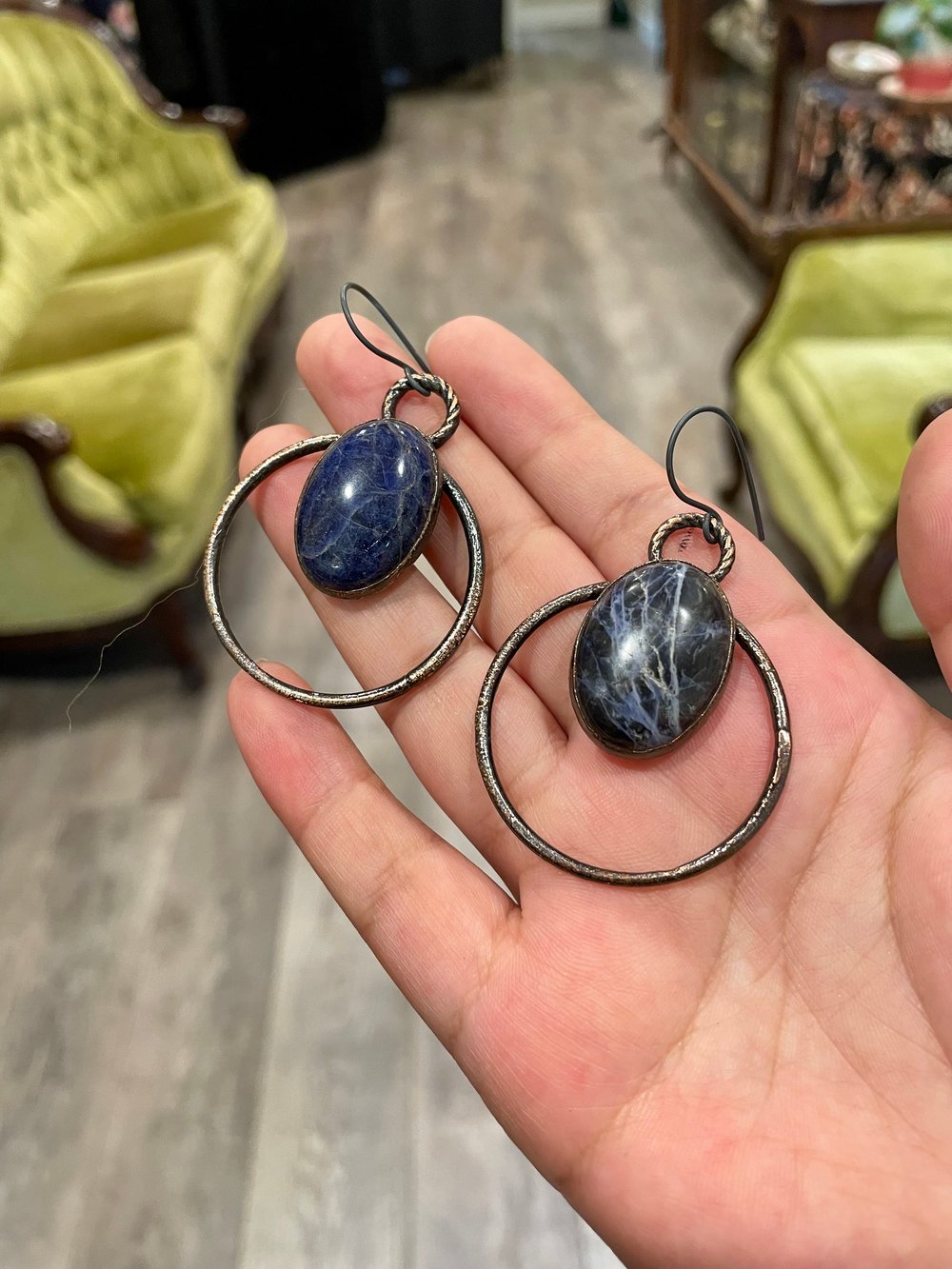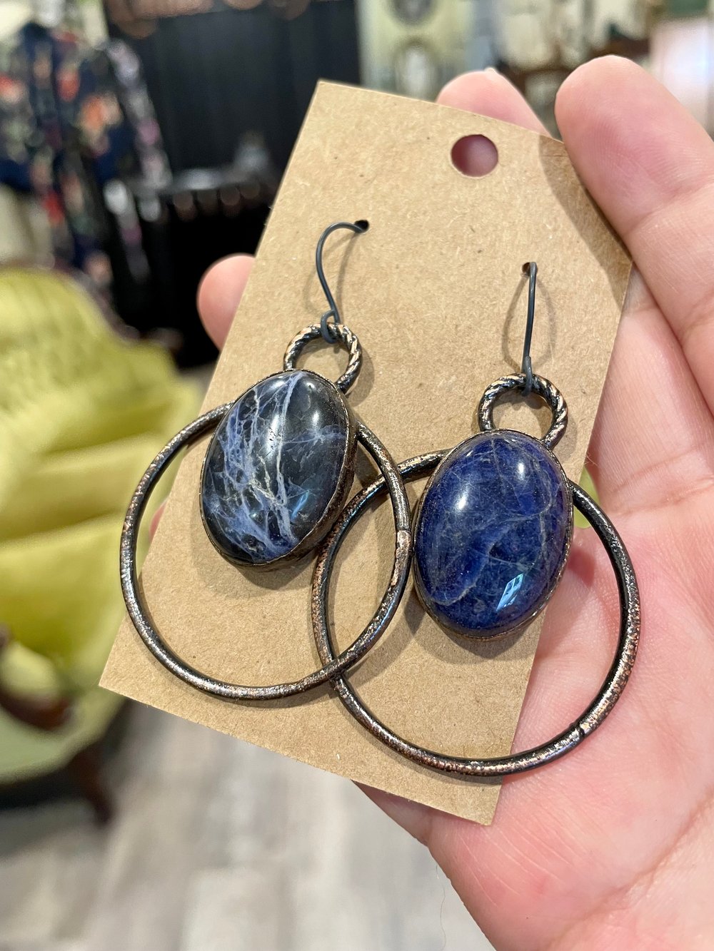 Medium sized electroformed copper hoop earrings with Sodalite stones.