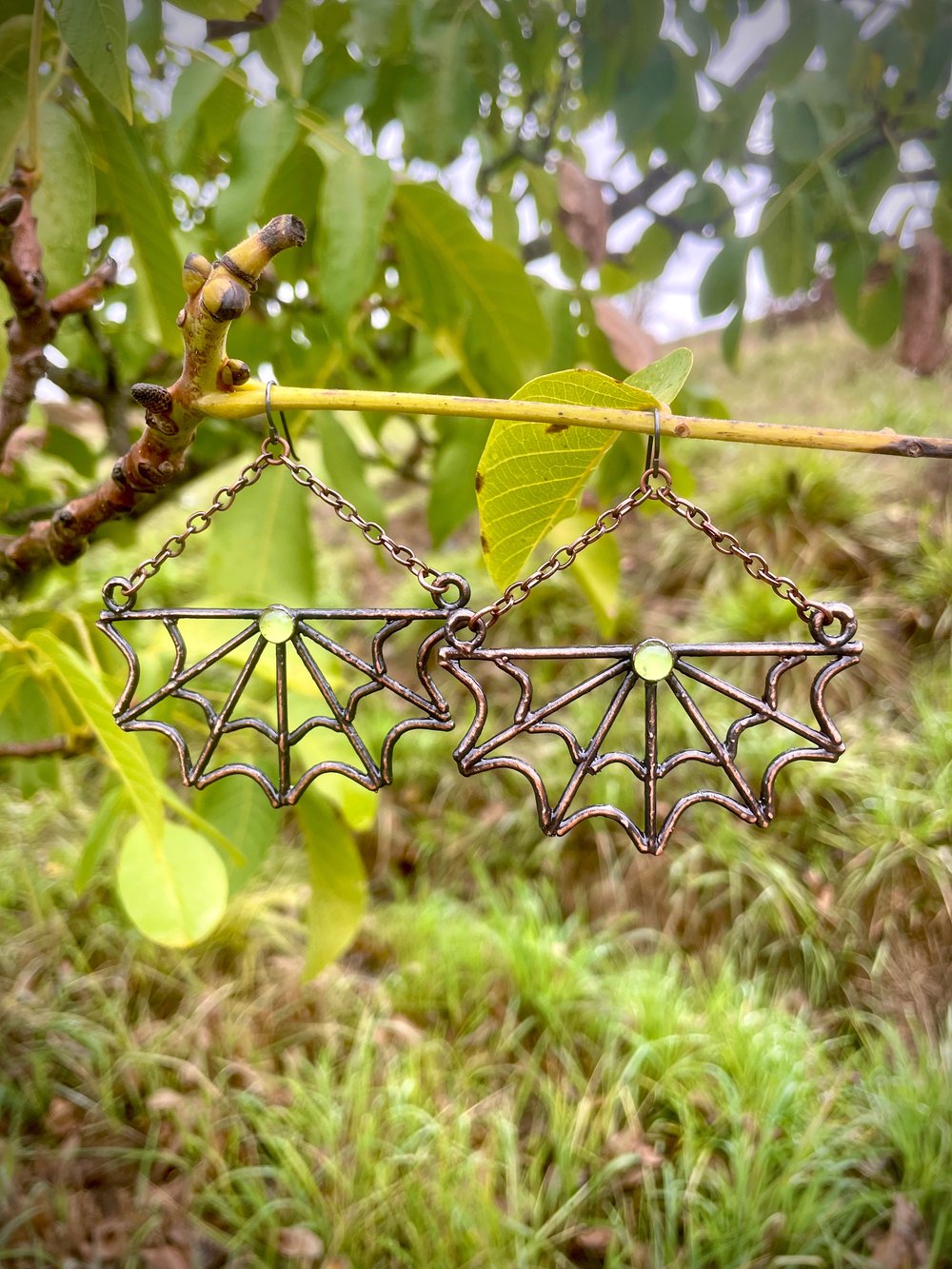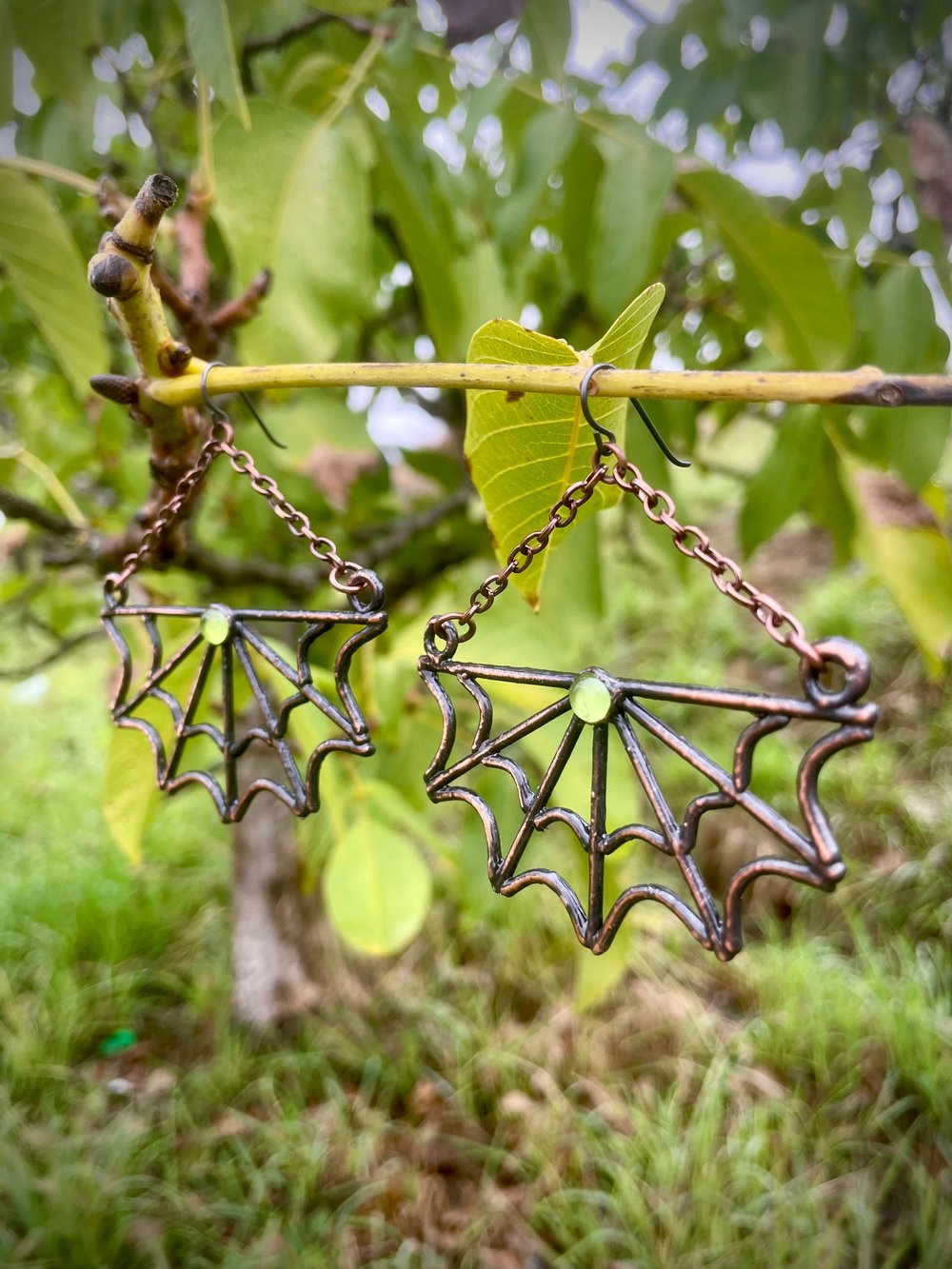 Webs were made with wire before being submerged in a plating solution and formed with copper. A patina was then added giving the earrings an aged finish.